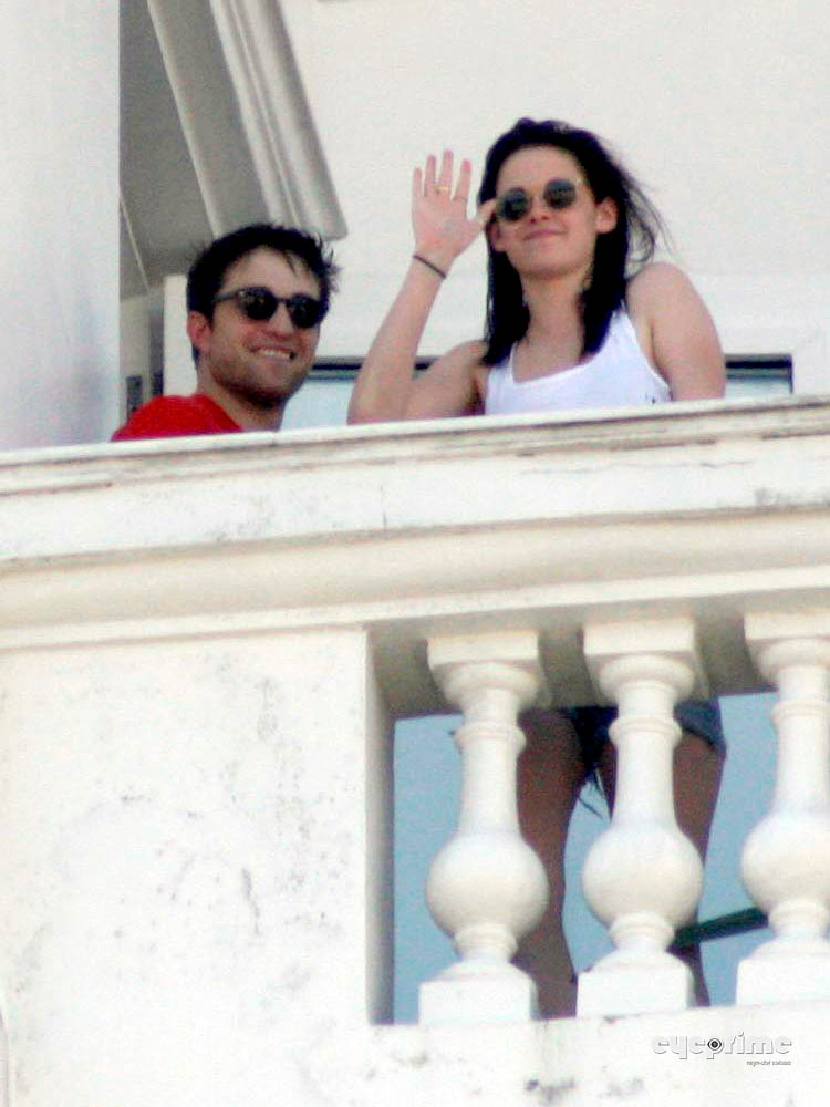Kristen Stewart and Robert Pattinson wave at Fans from the Copacabana Palace in Rio, Nov 7